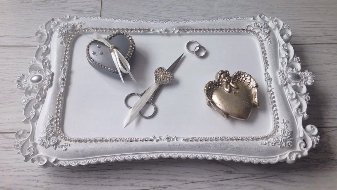 Yüzük kurdelesini keseceğiniz makas, tepsi setinin ayrılmaz bir parçası olarak dikkat çekici bir estetik sunar.