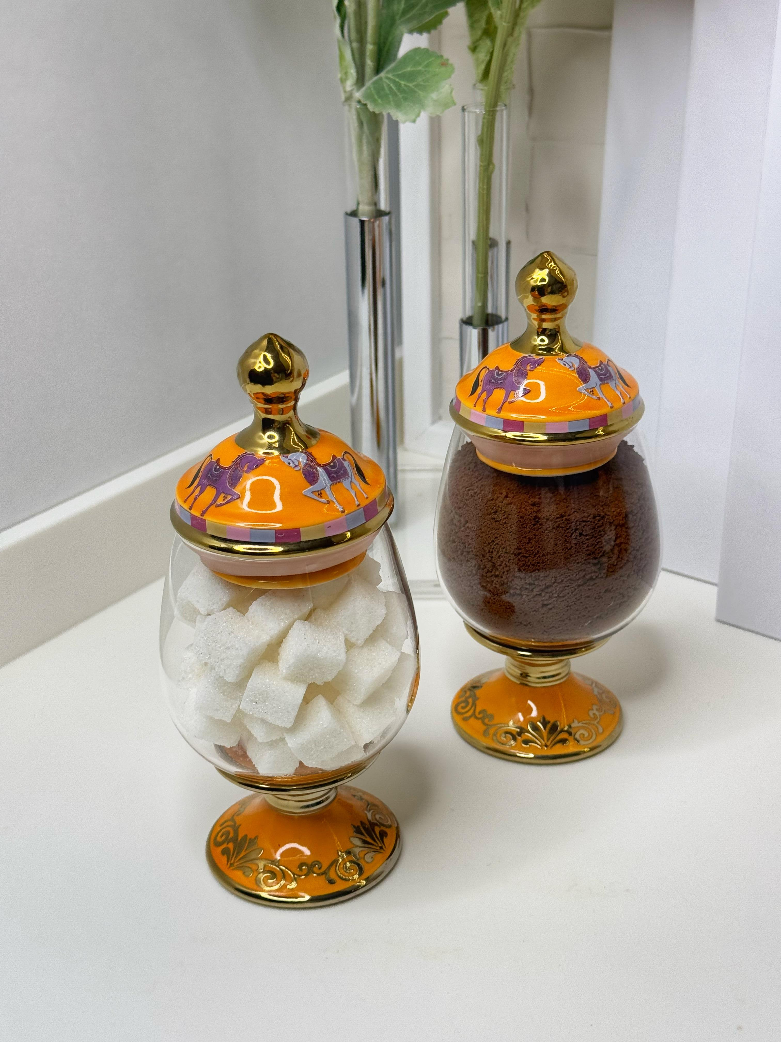 Cam gövdesiyle içerik kolayca görülebilir, altın detaylı porselen kapak ve ayak tasarımıyla mutfağınıza zarif bir dokunuş katar.