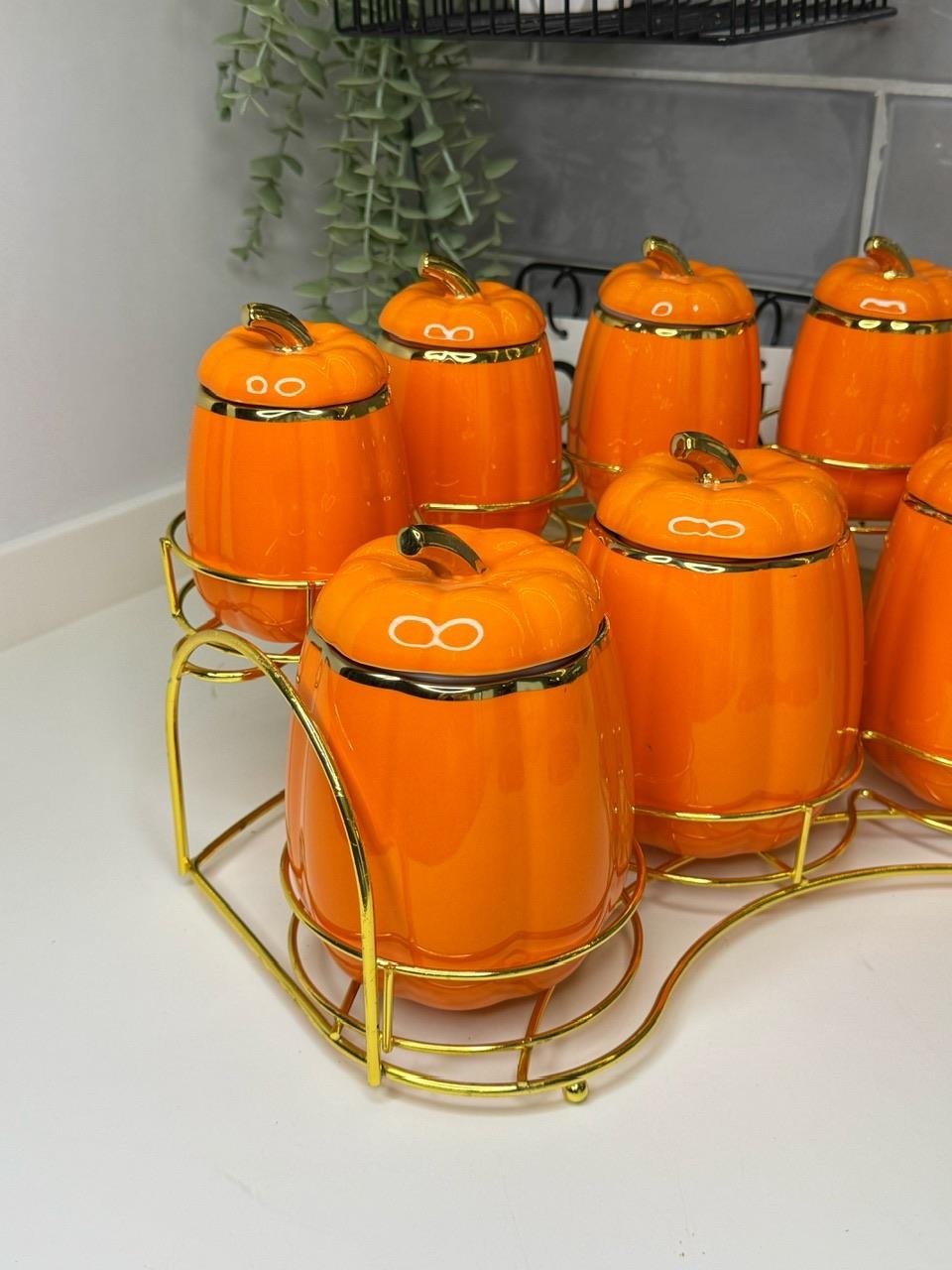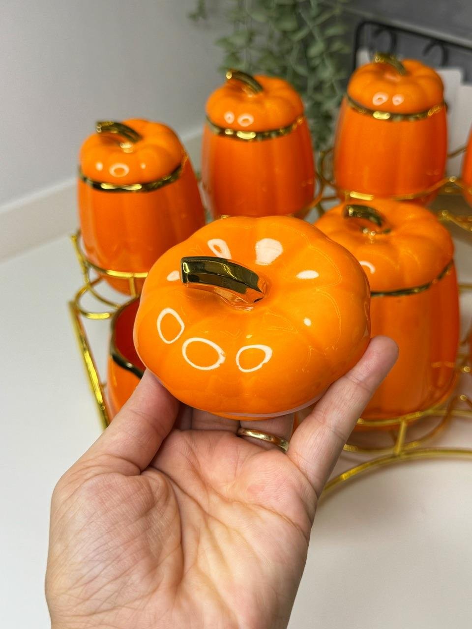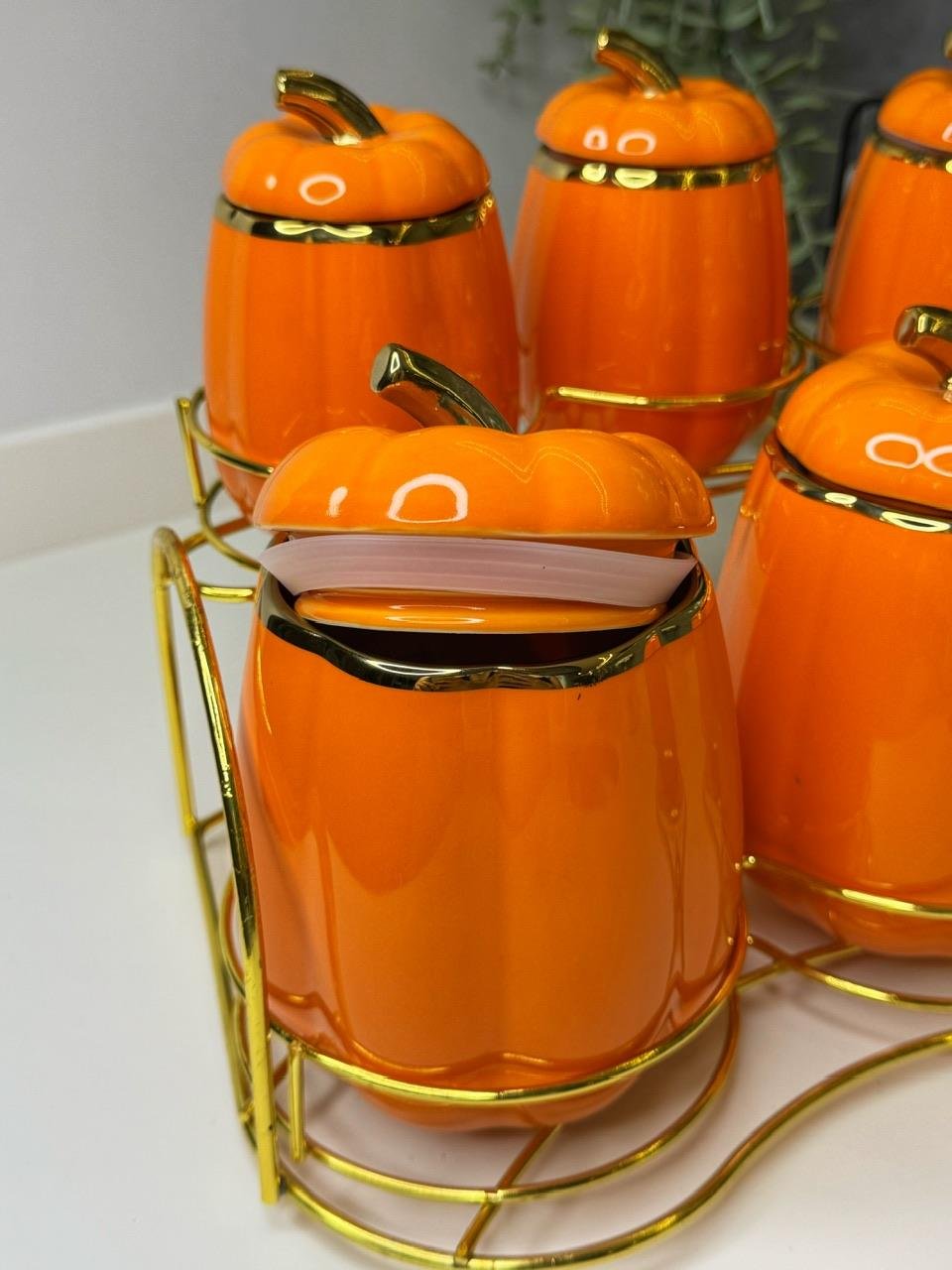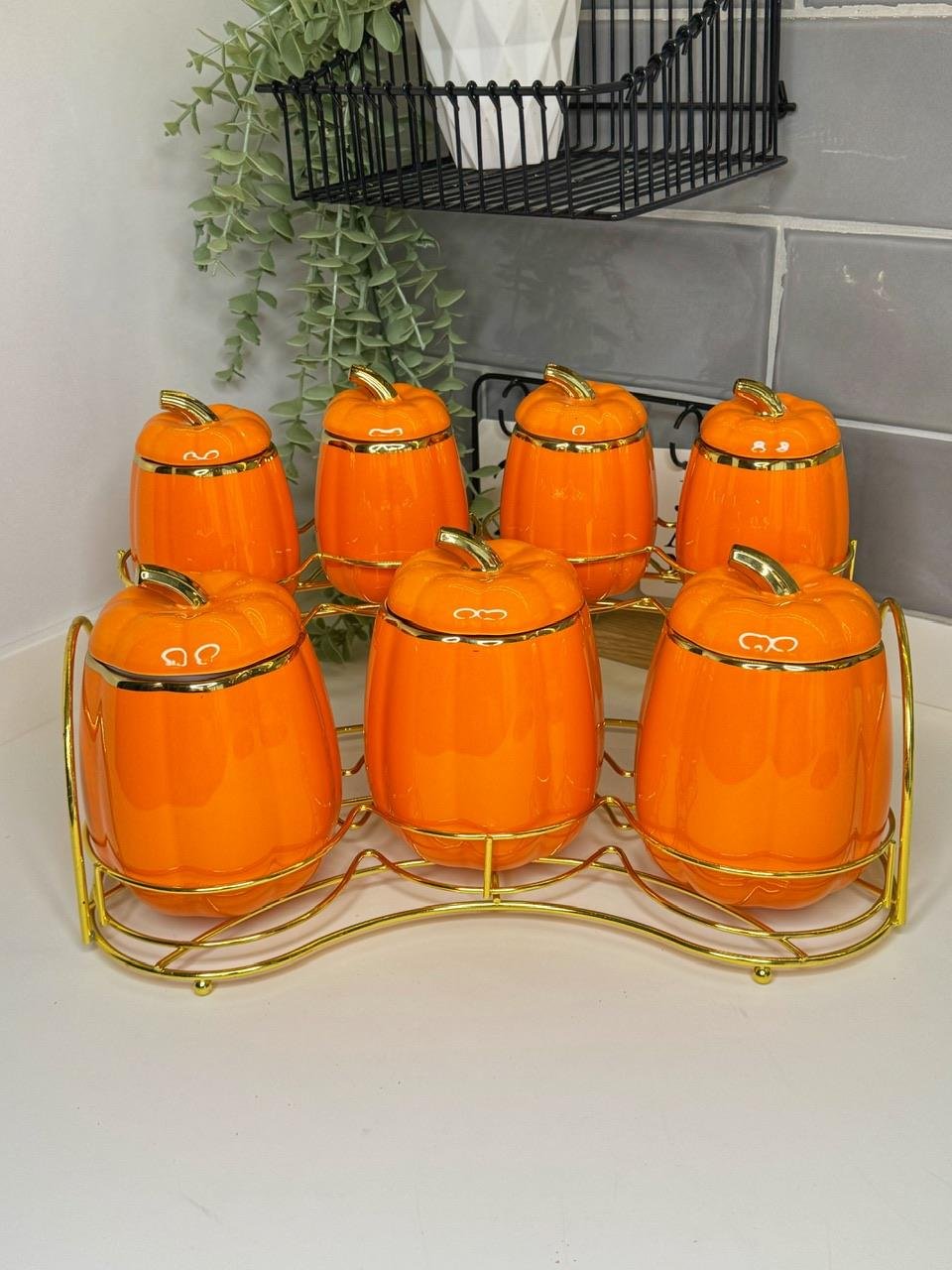 Kabak Model Standlı Porselen Baharatlık – Turuncu ve Gold Detaylı Modern Tasarım