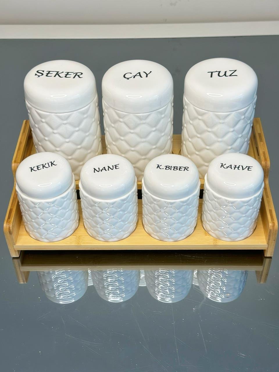 • Metal tepsili vakumlu 7'li porselen baharatlık seti.
